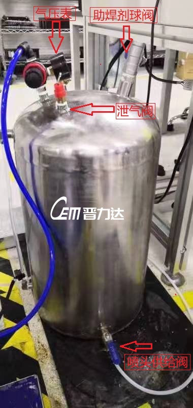 壓力罐也采用316不銹鋼制作,整體采用焊接密封,通過球閥注入助焊劑,關閉閥門,加注經過干燥后的空氣壓力,通過氣壓擠出助焊劑至噴嘴處,能保證供液的穩定和均勻性,對助焊劑穿透到焊盤內有很大幫助,對后續波峰焊接上錫透錫至PCB板面很關鍵,助焊劑沒有穿透元件腳至焊盤孔內,錫就無法爬升至PCB表面。缺點是造價較高,維護較為困難,工程師需要一定的操作基礎。