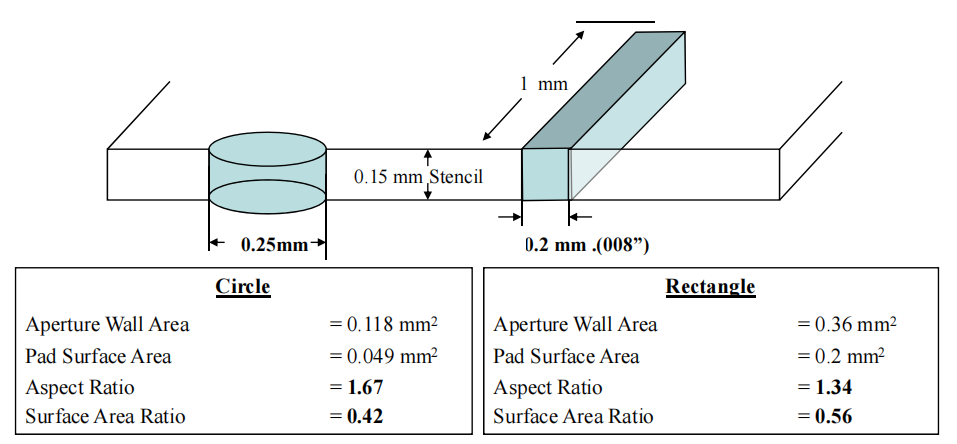 測試數據表明,對于小孔徑,方形孔表現要比圓形孔要好,如下圖所示(結果來自于一個0.005”的電鑄鋼網)