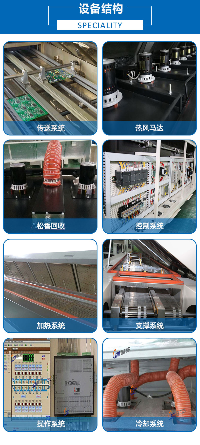 ● 各溫區采用雙熱風通道強制獨立循環,獨立PID控制,上下獨立加熱方式,使爐腔溫度準確,均勻,熱容量大;雙熱風通道加熱方式, 解決了回流焊焊接時的死角難題.適合CSP、BGA、0201CHIP等電器元件的焊接.